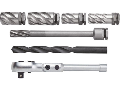 Includes: (Qty.) (1) 133 X 10 mm reamer, (1) 42 X 14 mm reamer, (1) 33 X 15 mm reamer, (1) 32 X 18 mm reamer, (1) 42 X 18 mm reamer, (1) 10 X 133 mm twist drill, (1) Fine tooth ratchet with hinge joint.