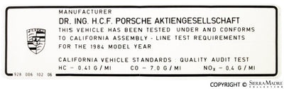 Porsche Decal for "Actual Emission Results" on the 1984 California models.