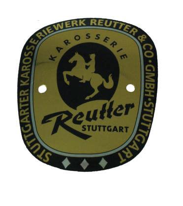 Porsche Reutter Stuttgart coach builder badge. It fits 1955 to 1959. Rivets and clips are included.